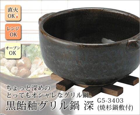 ギフト対応 商品名:黒飴釉グリル鍋 深 G5-3403 旬なキーワード:鍋 深め グリル 直火 レンジ オーブン 美味しい あったか 家族 友達 集い 冬 食卓 一人鍋 鍋パーティー プレゼント 陶器 日本製 焼杉鍋敷付